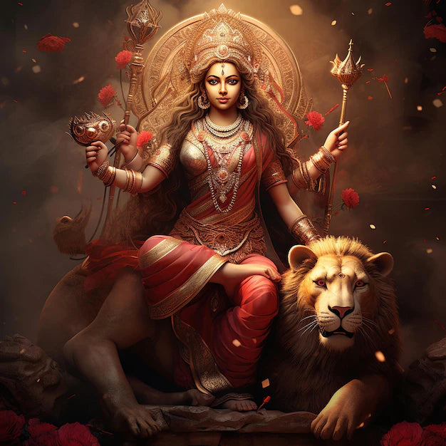She is often referred to as just ‘Maa’ meaning ‘THE Mother’. She is portrayed with a Tiger- symbolising ferocity, as she is fiercely protective of her devotees. Depicted with many weapons and arms, she takes form to fight and protect against evils and injustices.