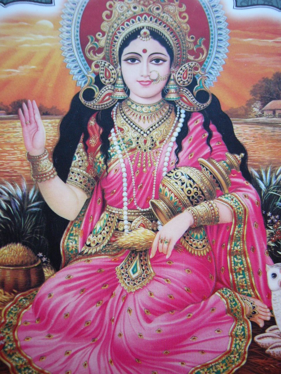 Often depicted on a lotus- representing her power to compound money, gold, and all forms of wealth. Her feet are therefore put at the doorsteps of Hindu households, so that she may walk into the homes and lives of those who wish to be prosperous.