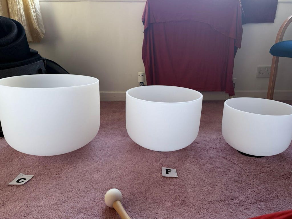 - 3 high-quality crystal singing bowls: 10" (B), 12" (F), and 14" (C)